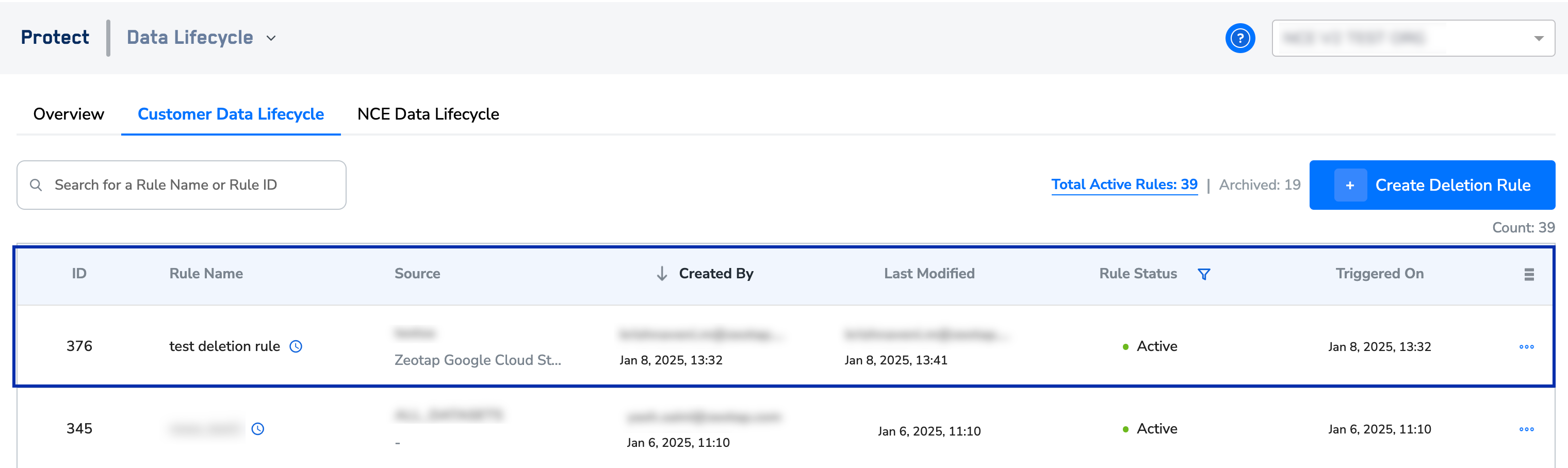 Triggered On – This is the timestamp of the last trigger of the deletion rule. After the rule triggers, the execution and deletion of records or data from the system can take 1 hour to 10 days. The duration depends on the data volume and the data pipeline sequence.
