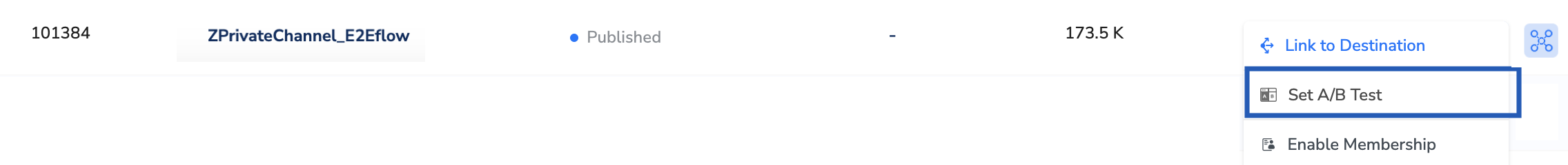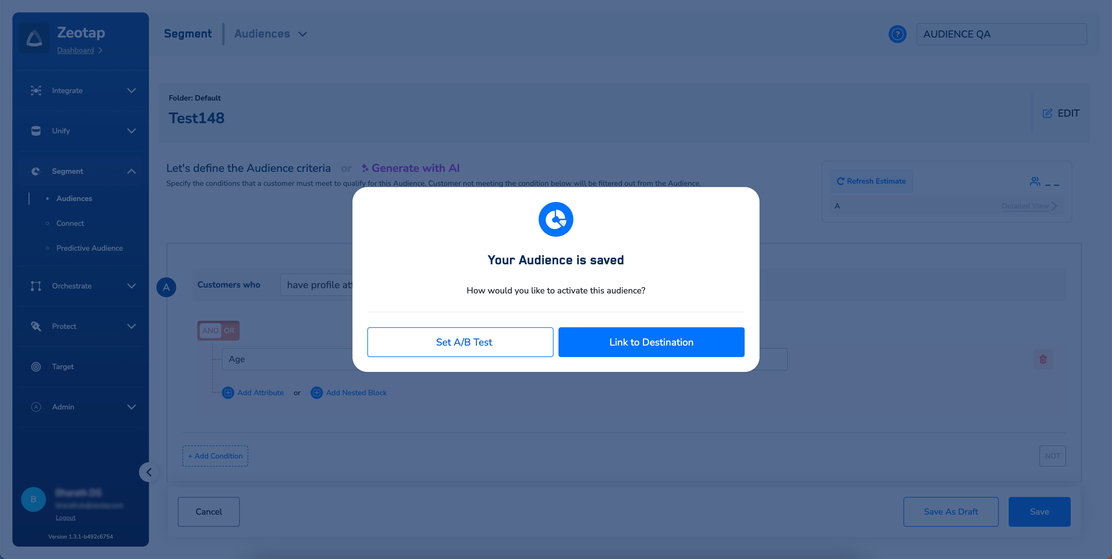 Once you have successfully applied the critera for your Audience, enable the A/B Test from the Audience activation screen by clicking Set A/B Test.