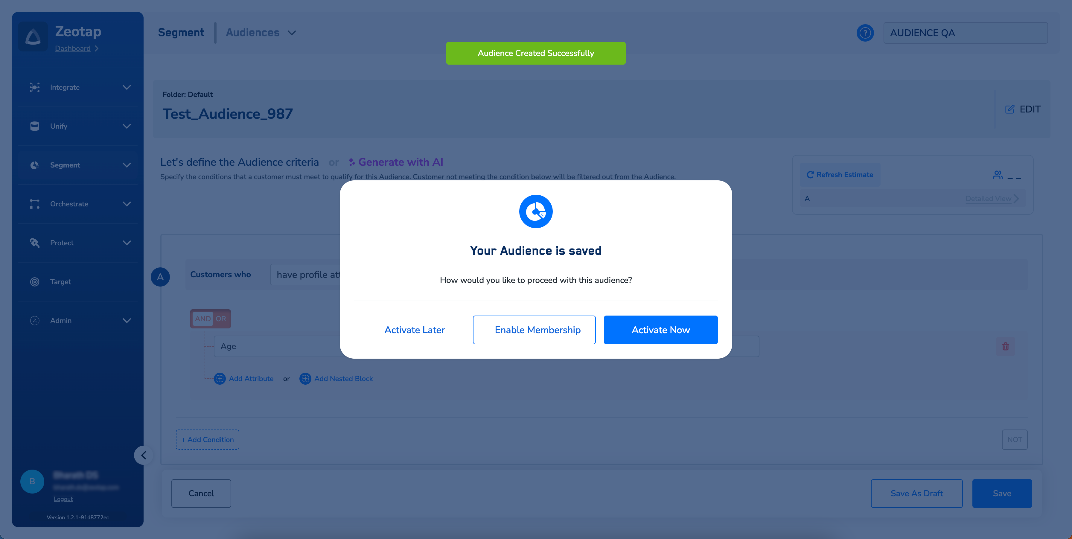 - Link to Destination – This functionality helps you to activate the created Audience by linking to a Destination. For step-by-step instructions on how to activate an Audience, refer here.