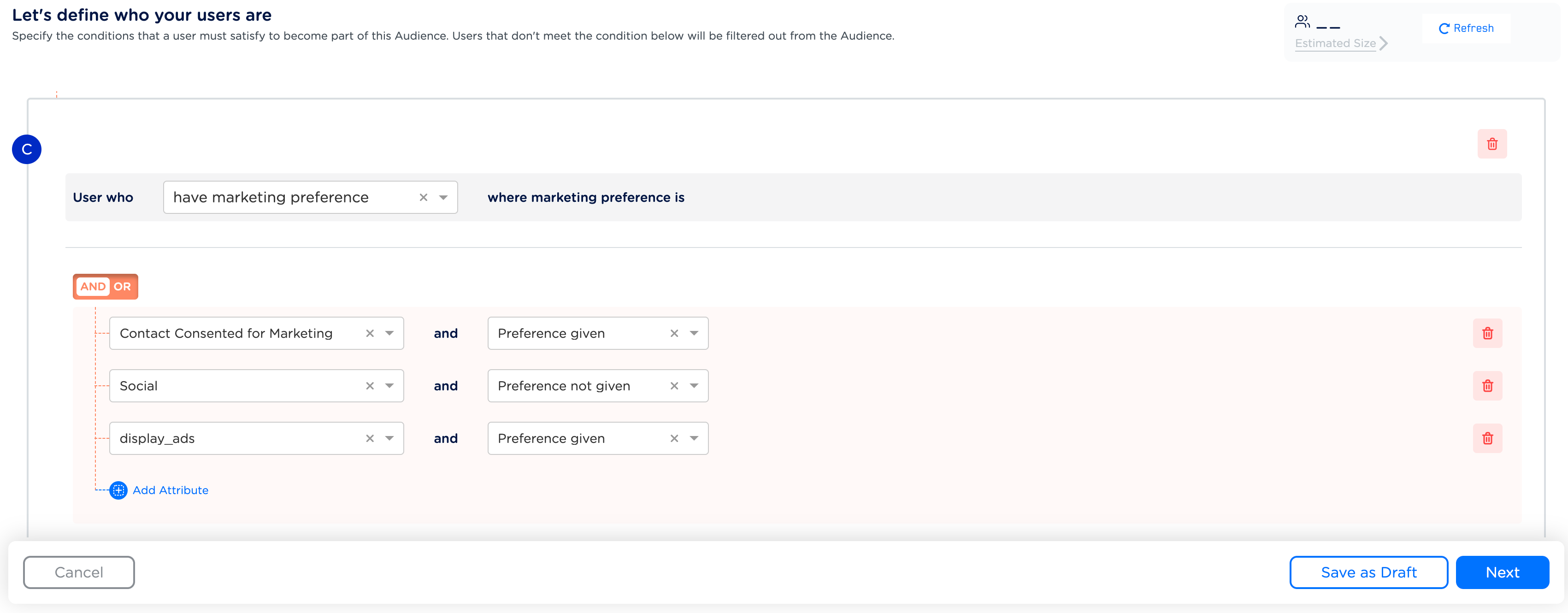 The Marketing Preference attribute allows you to capture and store user preferences related to marketing communications. It stores only one value per attribute. Hence, a new value always overrides the existing value after ID resolution. Example As a marketer, you want to target customers who have given explicit consent to receive your marketing communications, indicating a higher likelihood of engagement. However, their social preferences are unknown. In addition, you want to ensure that the audience is open to receiving ads displayed on your website. In this scenario, you can use the Marketing Preferences attribute to create this audience as shown in the image below. In this way, you can group your audience more accurately, leading to more effective marketing campaigns.
