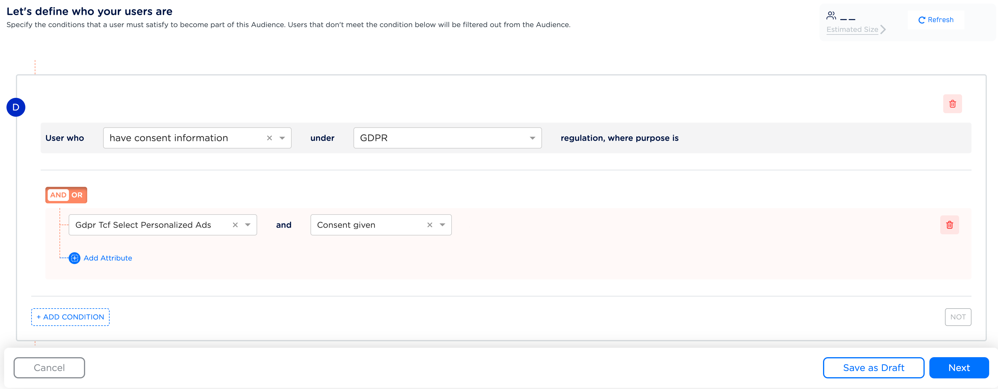 The Consent Attribute enables you to select the user preferences regarding consent for data processing activities in compliance with GDPR, CCPA and other regulations. It stores only one value per attribute. Hence, a new value always overrides the existing value after ID resolution. Example You can build a group of customers who have explicitly given consent for their data to be used for personalised advertising in accordance with GDPR. This ensures that you target only those customers who have willingly provided their consent for data processing activities. In addition, it complies with relevant data protection regulations.