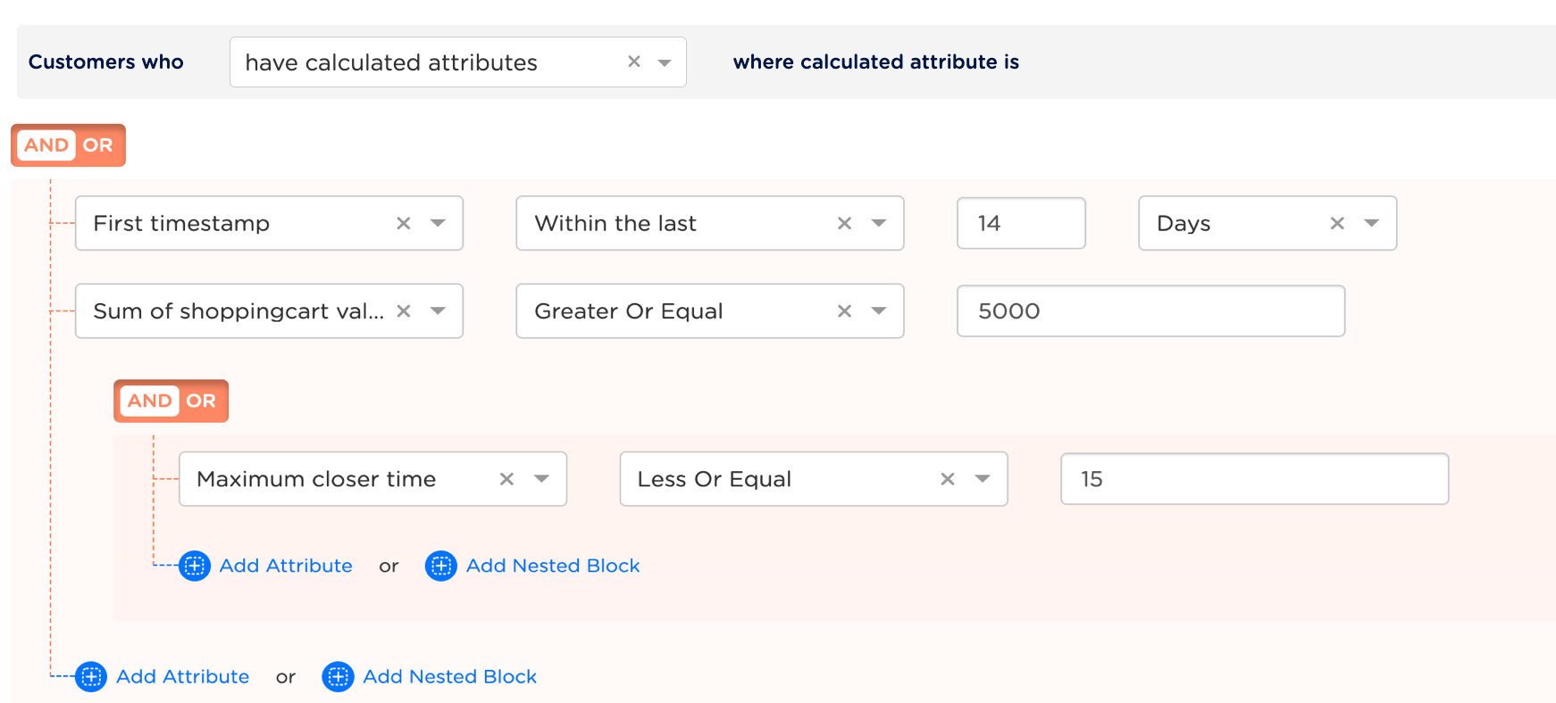 Calculated Attributes allow you to derive user-level insights by aggregating your customers’ isolated actions. You can then use this data to create powerful cohort of customers/Audience. Create new attributes for a user by aggregating their event data over a specific time period. Example Let’s say you wish to create an Audience whosefirst _timestamp falls within the previous 14 days, whose sum_of_shopping_cart_value exceeds 5000 Euros and their maximum_closer_time for all transactions is less than 15 minutes. To achieve this, use the Calculated attribute to set the criteria and add the properties as shown in the image below.