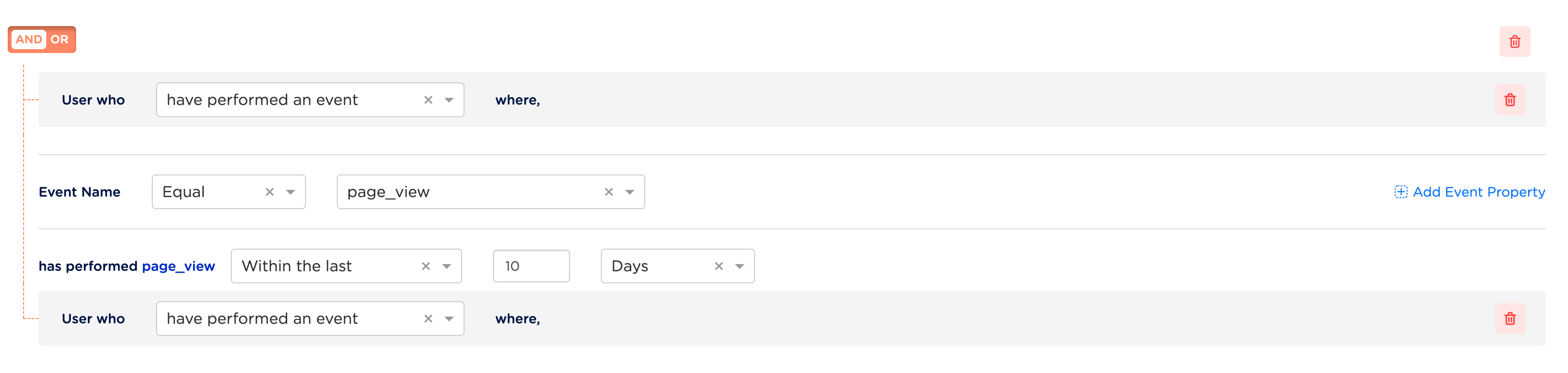The Events attribute allows you to capture the event types based on event_name and event_timestamp that are mapped in the catalogue while ingesting the source. Note that the event_name is filtered first, followed by the event_timestamp as shown in the conditional block below. The events can include the user action information such as addToCart, pageView and so on. This attribute stores time series information. Hence, the information is only appended against a user profile after ID resolution. Example Let’s say you wish to create an audience that comprises of customers who have recently viewed a product and added it to their cart. To achieve this, use the Events attribute to set the criteria and add the events properties as shown in the image below.- A customer who performed a page_view event within the last 10 days, indicating an active interest in the product.