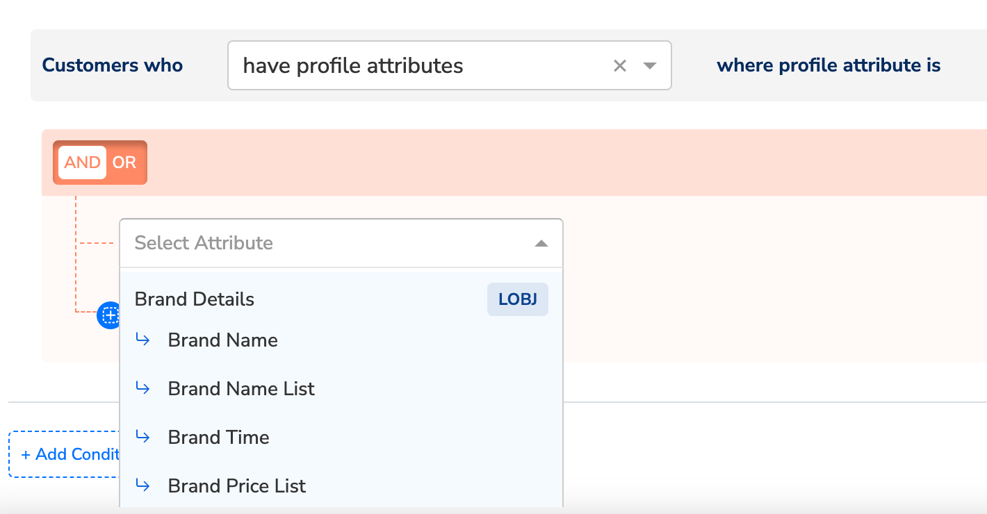 List of Objects attribute, choose either ANY or ALL as the operator based on requirement.- ANY qualifies customers for your Audience if at least one of the Objects in the list meet the specified conditions.