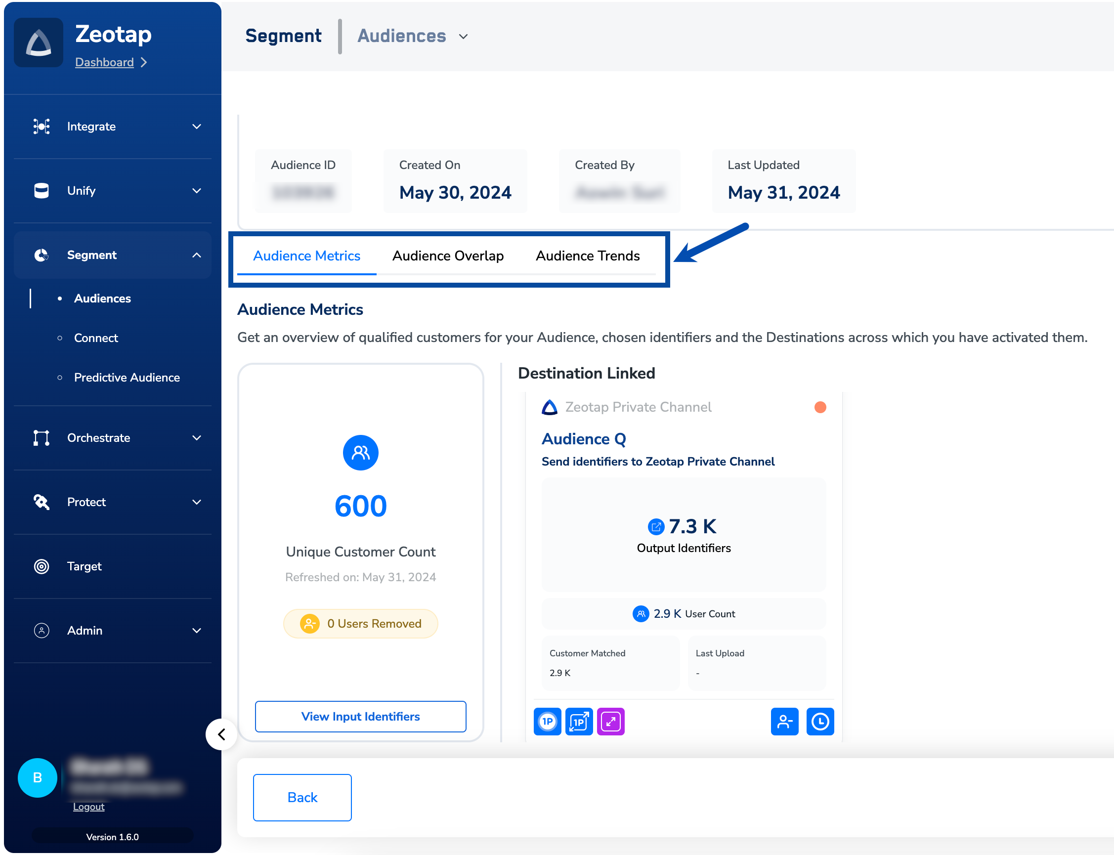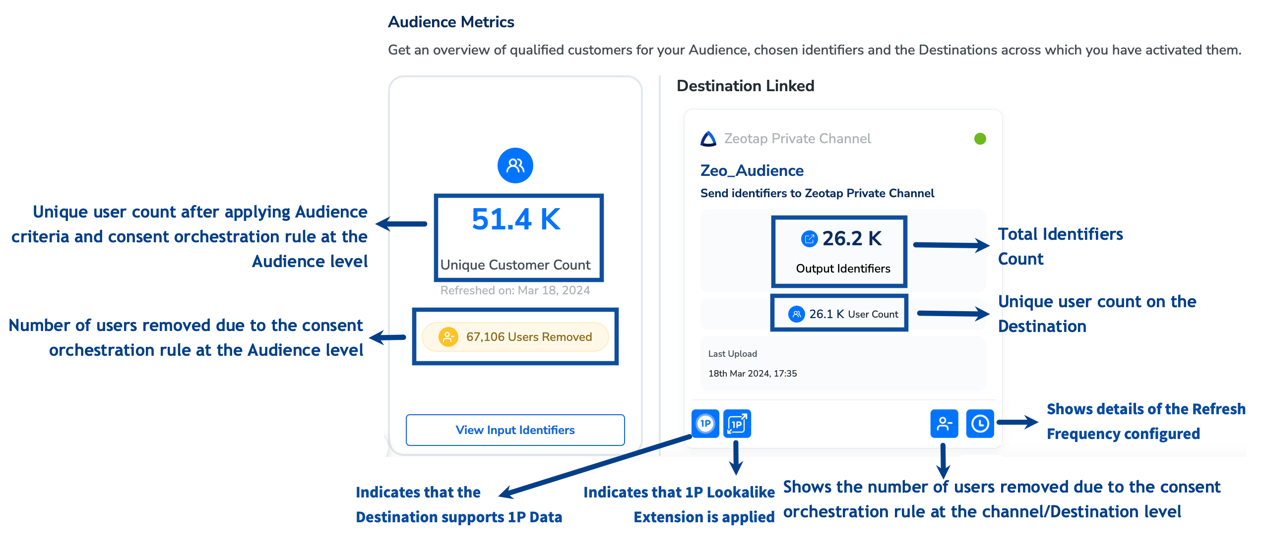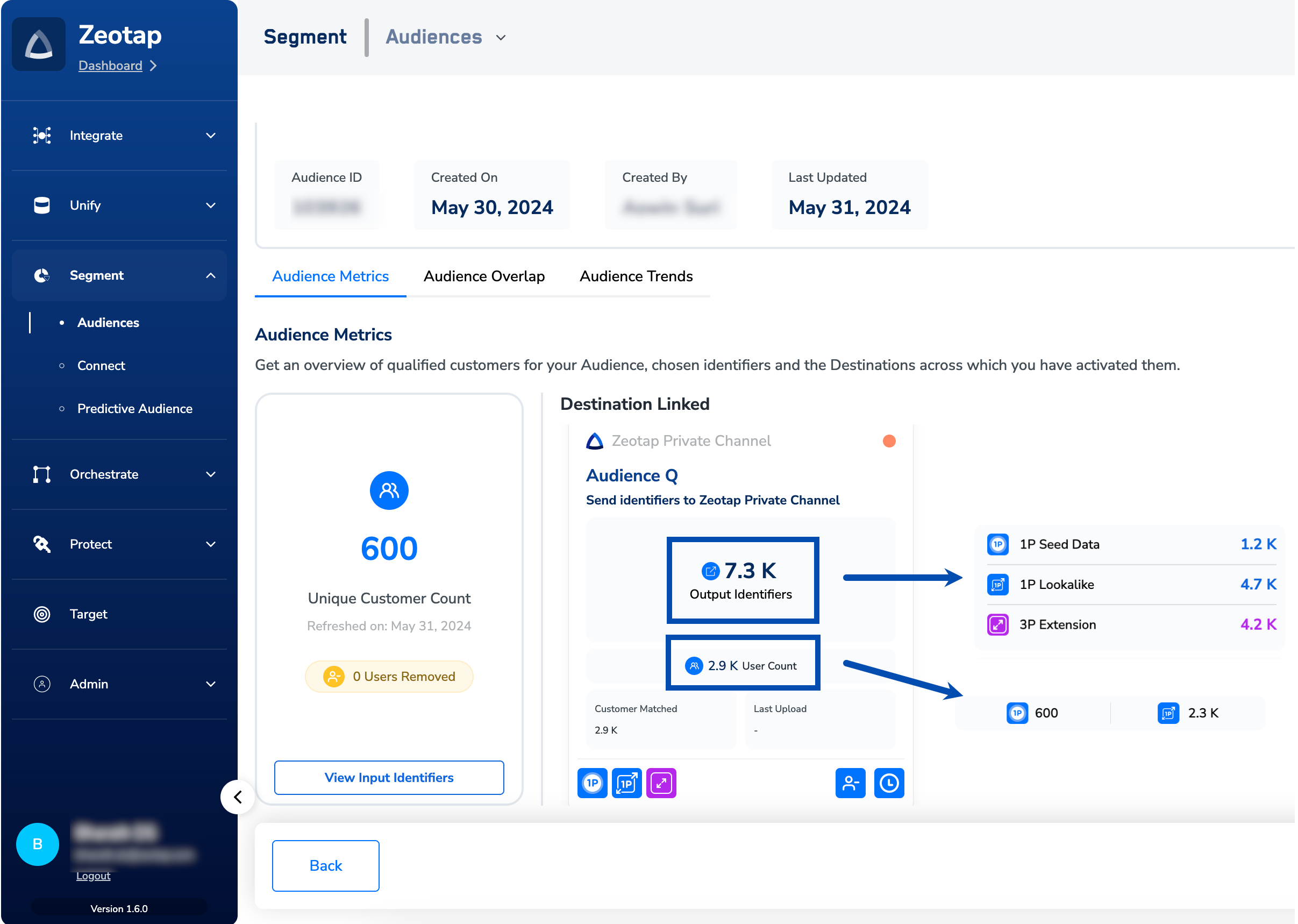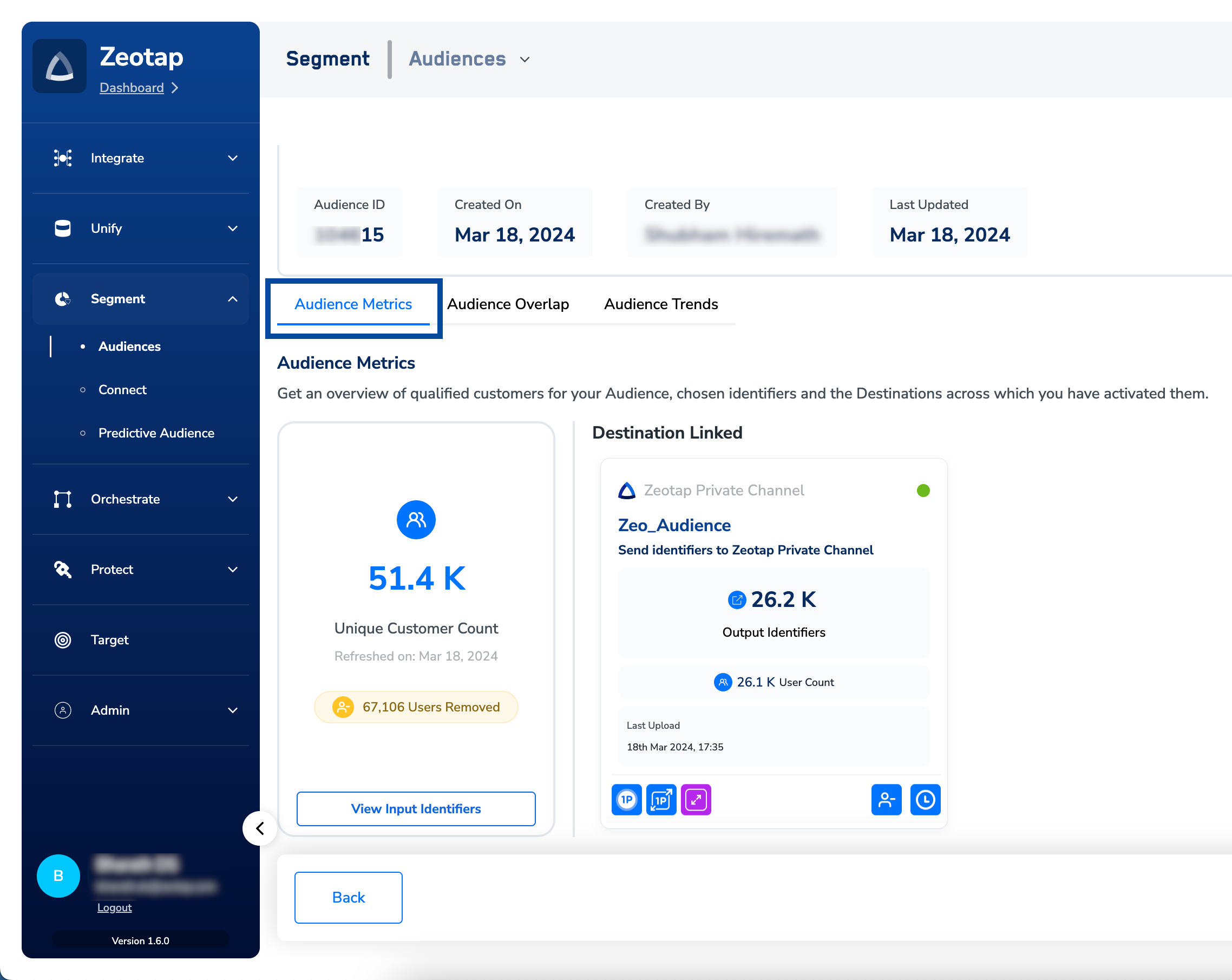 In the Audience Metricstab, you can get an overview of the Unique Customer Count along with the detailed breakup of the Identifiers chosen and the Destinations across which you have activated them.