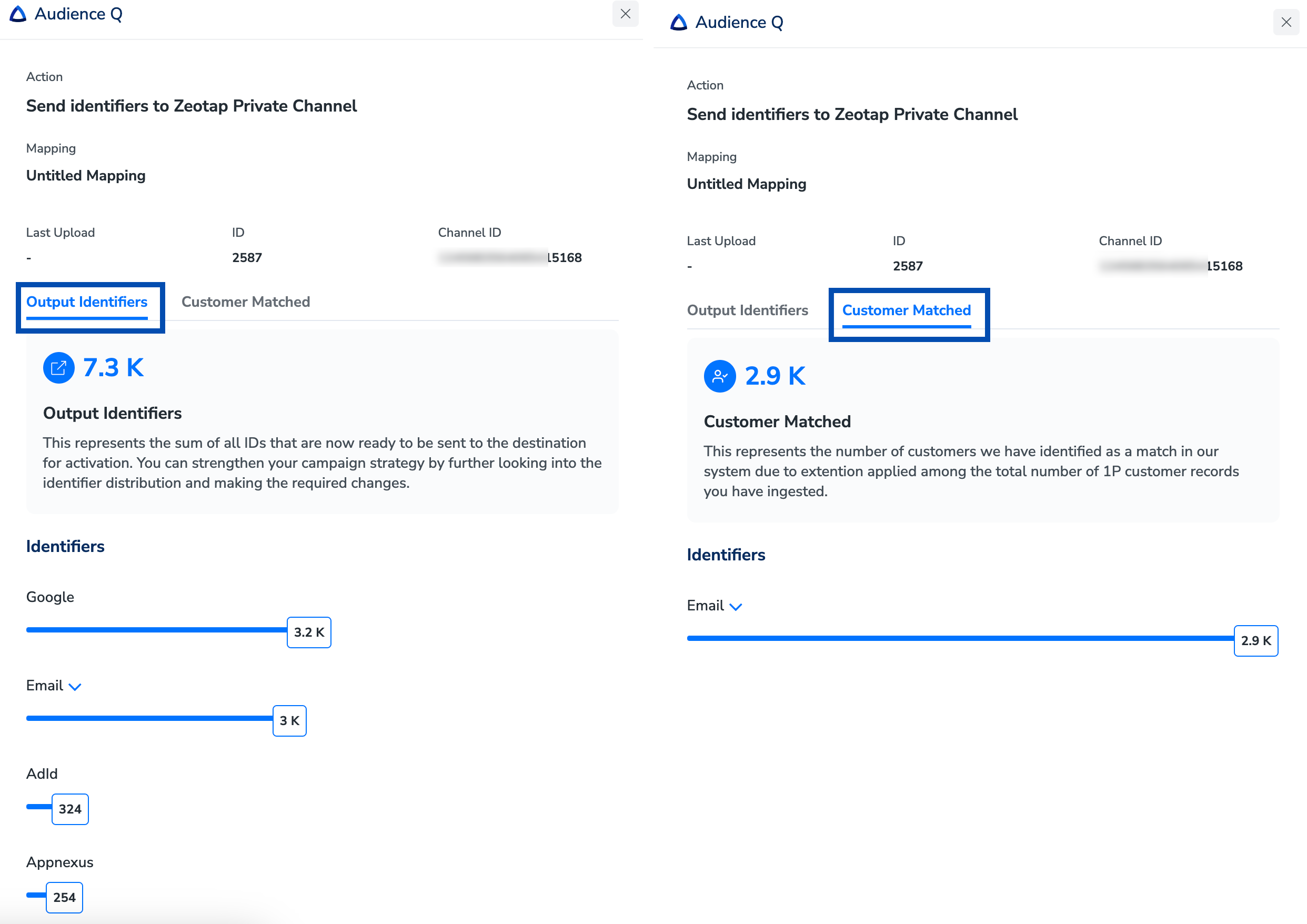 Note:The number under Output Identifiers represent the count of identifiers meeting the criteria you have set for your Audience after applying Consent Rule at Audience Level and Consent Rule at Channel Level.