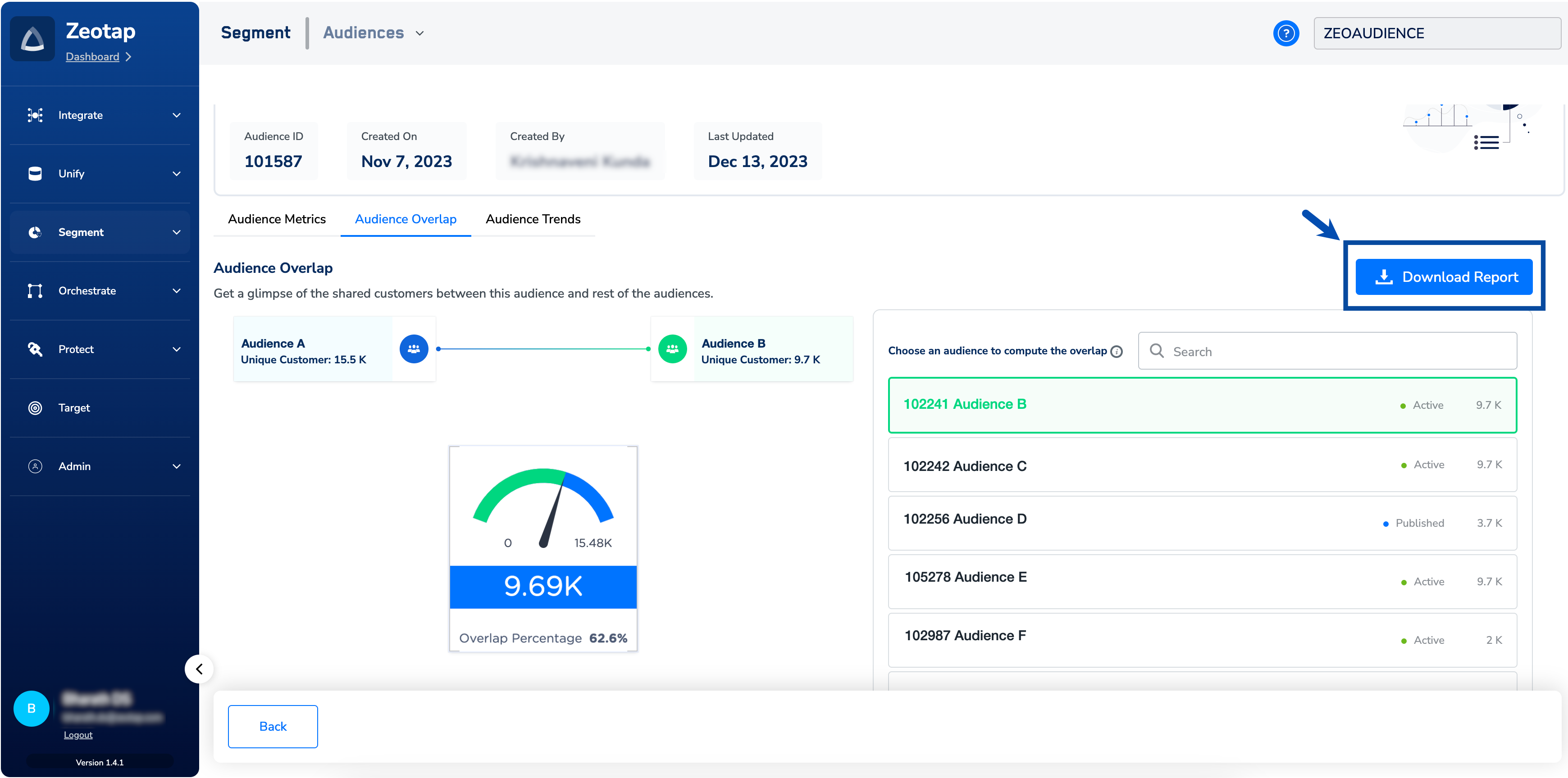 In the Audience Overlap tab, you can view the unique customer counts of the two Audiences that your are comparing, along with the count of customers common to both. Note that one of the Audience has to be the one that you are working on, while you can choose the other Audience from the rest of the Audiences in Active and Published statuses, either by using the search box or by scrolling through the list. The overlap count and percentage may differ depending on the Audience you choose. You can download the complete overlap report of the selected audience with all existing audiences in the account by using the Download Report button shown in the image below. The report will be a CSV file showing the percentage overlap of the selected audience with all the other audiences in the account.