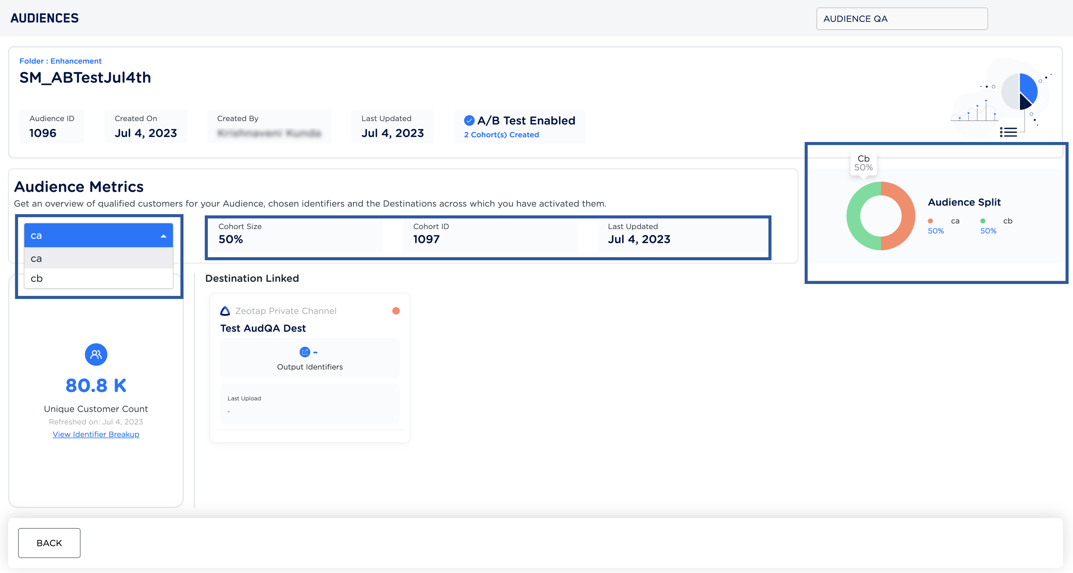 When you check the Audience Insights for an A/B Testing enabled Audience, you can choose the cohort for which you wish to view the metrics. Once chosen, the screen displays relevant information about the selected cohort, including theCohort Size, Cohort ID, and Last Updated date. By hovering over the Audience Split circle, you can also see the percentage share of each cohort. The process of viewing Audience metrics and the linked Destinations for each cohort is similar to the method mentioned above.