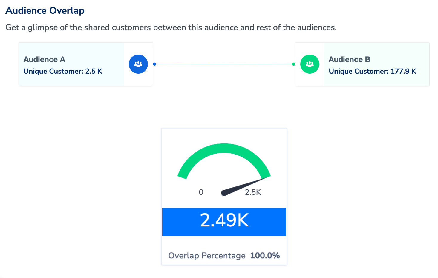 Audience Overlap denotes the shared customer percentage between two Audiences, providing valuable insights into customer behaviour for effective marketing strategies. It refreshes every three (3) hours. Let’s consider the following example showcasing the Audience Overlap feature: Consider two distinct Audiences mentioned below.- Audience A - Targets 2.5K unique Fitness Enthusiasts interested in gym memberships, workout apparel and fitness equipment.