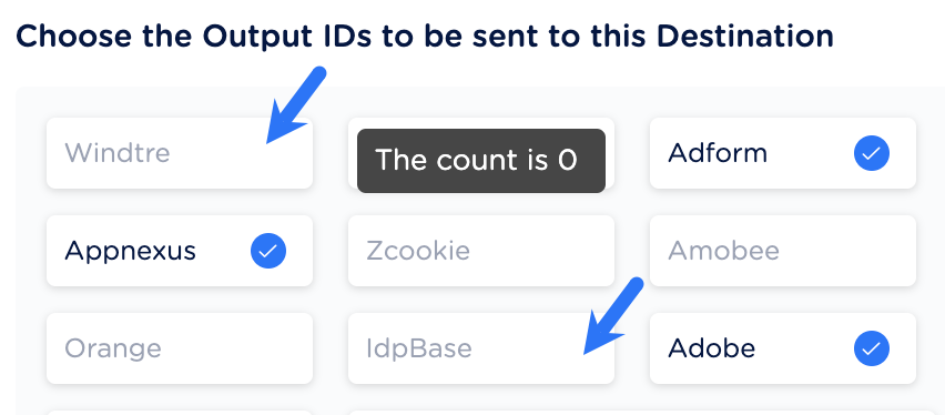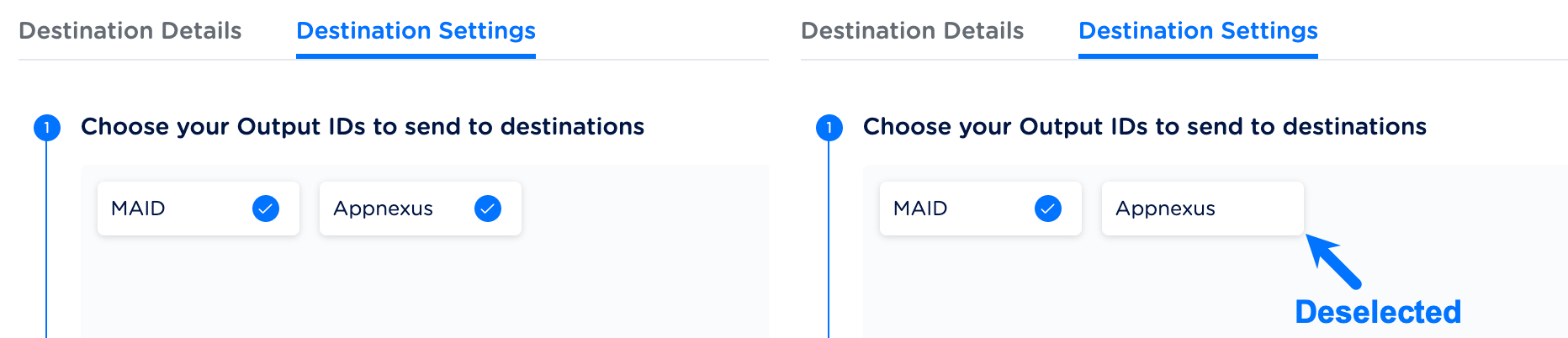 Once you have dragged and dropped the destination or created a new destination to which you want to push your Audience. In the Destination Settings window, perform the following steps:Under Choose your Output IDs to send to destination, all the Output Identifiers that are accepted by the platform are populated. The Output IDs can be MAIDs, Cookies, email addresses and so on. By default, all the identifiers displayed are selected. You can click a particular Output Id to deselect it. In the below example, Appnexus cookie is deselected. Therefore, only the selected Identifiers are used for targeting customers over the platform.