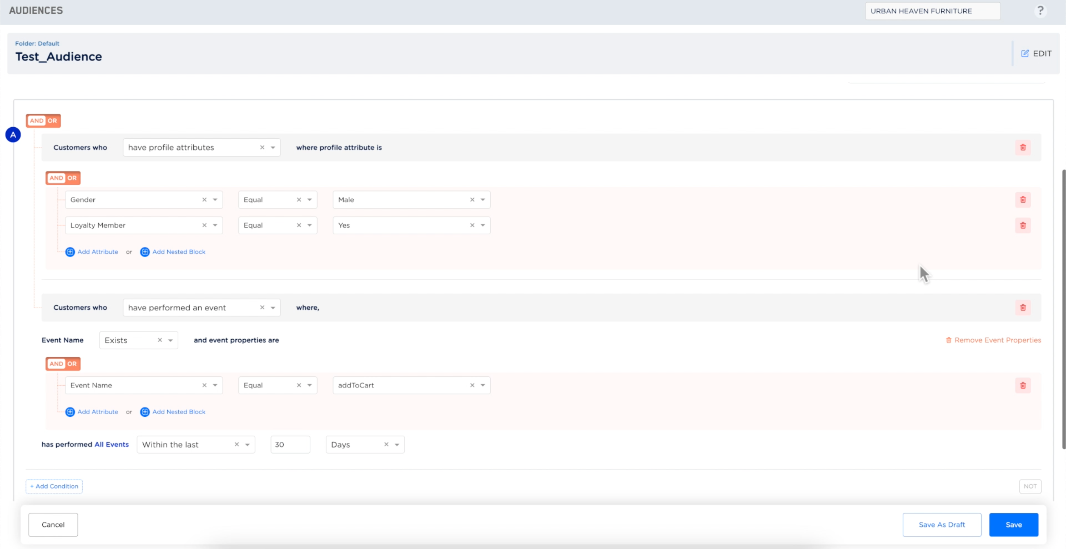 Let’s say, you want to use Ada with the prompt “All users who are male and are loyalty members and have performed an add to cart in the last 30 days”.The AI system automatically generates the conditional blocks/criteria for your Audience, as shown in the image below. In this case, the prompt “All users who are male and are loyalty members and have performed an add to cart in the last 30 days” breaks down into two conditional blocks. The first block defines profile attributes, such as Gender and being a Loyalty member, while the second block defines the event “add to cart” within the last 30 days.