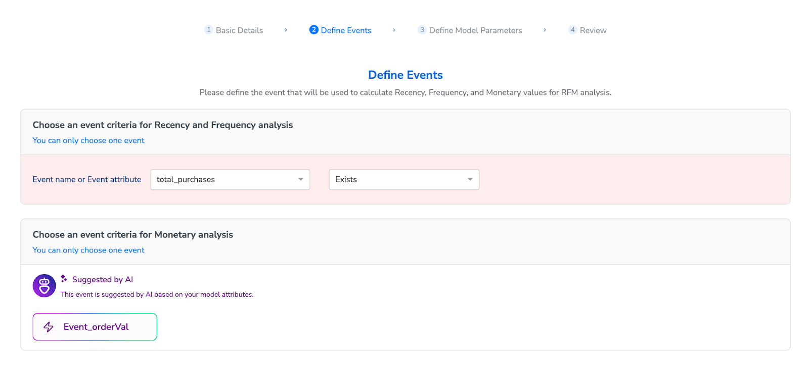 - Event for Recency and Frequency: Choose the event that represents the key transaction for your business. For a retail business, this could be a ‘purchase’ event. For a telecom provider, it could be a ‘recharge’ or ‘plan_renewal’ event.