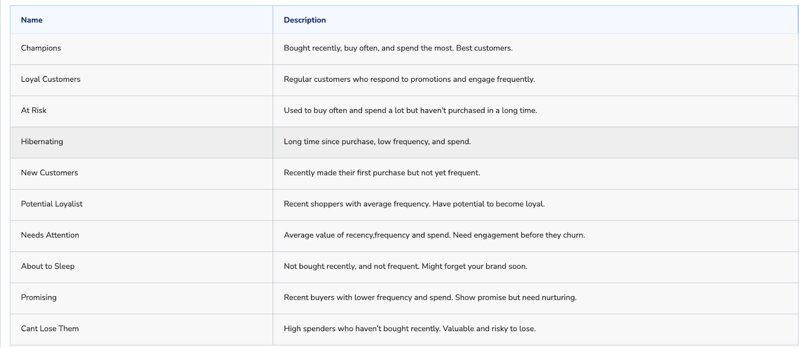 For Retail:- Nurture Potential Loyalists: Create a segment of “Potential Loyalist” customers and launch upselling campaigns, upgraded to loyalty membership tier or early access to sales to convert them to ‘Champion’ users.