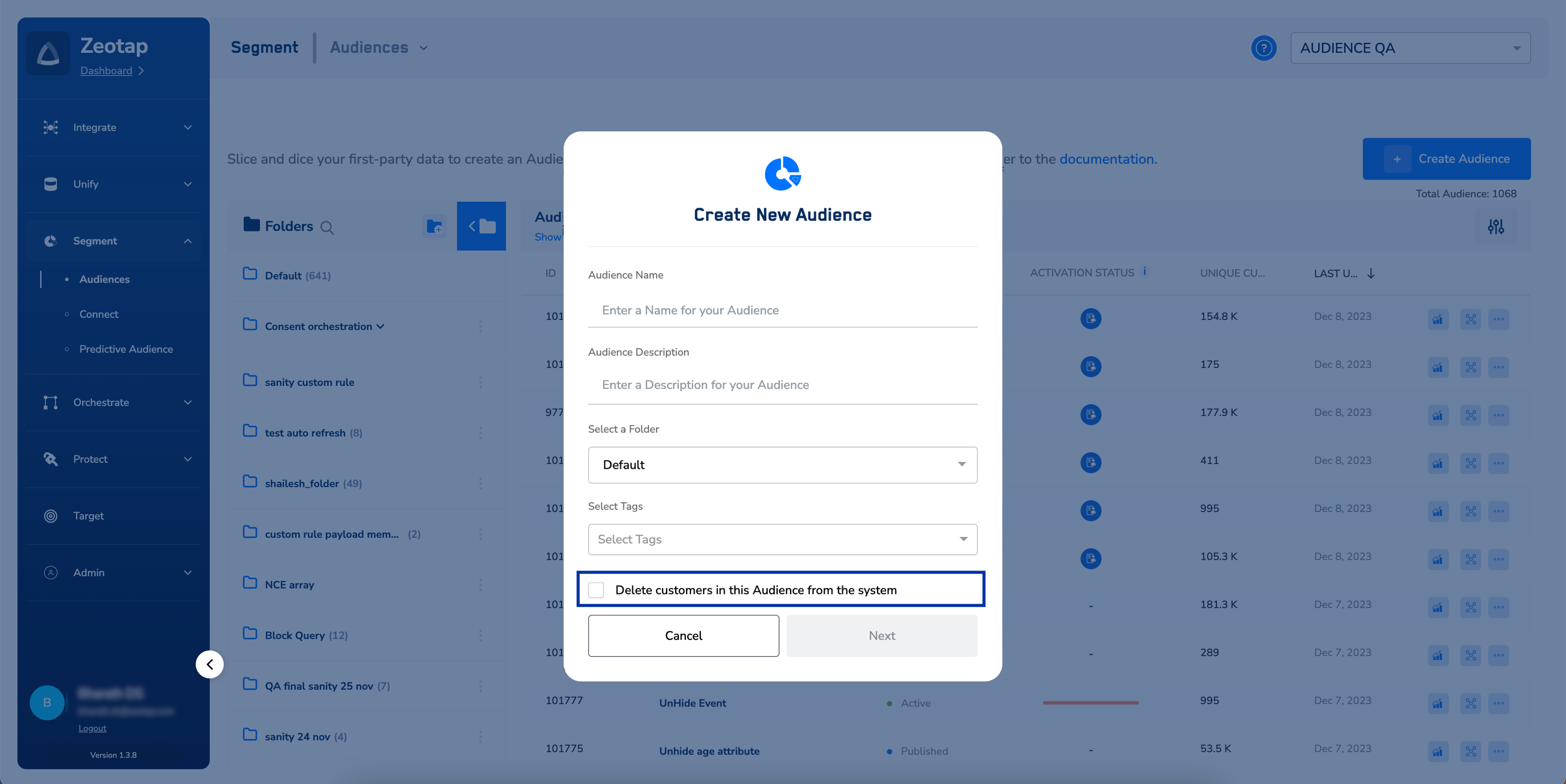 - If you select the checkbox, then the Audience cannot be activated on any Destination.