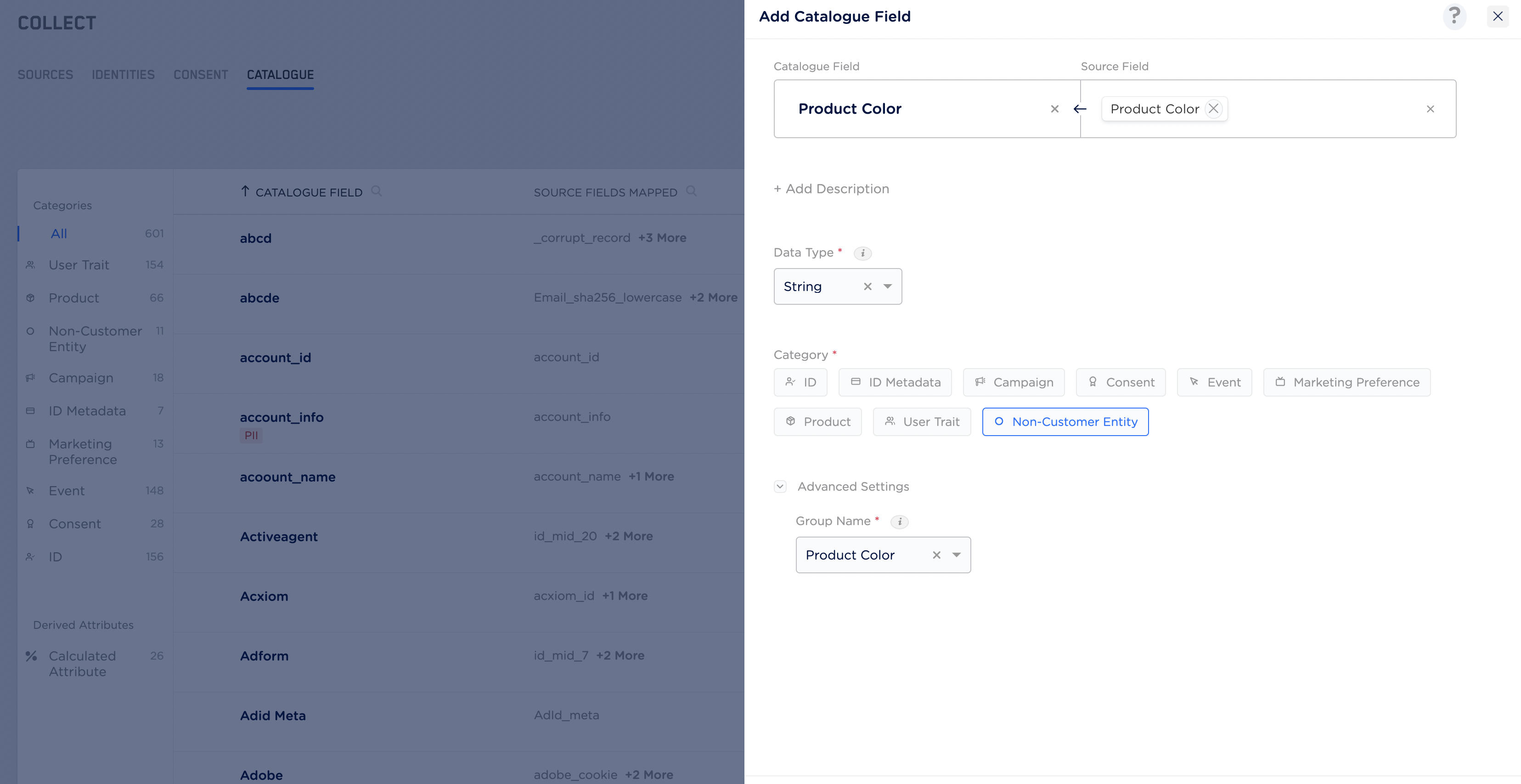 Enter a Catalogue Field. As you type, suggestions based on the existing Catalogue Fields appear. You can choose a suggested Catalogue Field or click +Add Catalogue Field to add a new field.