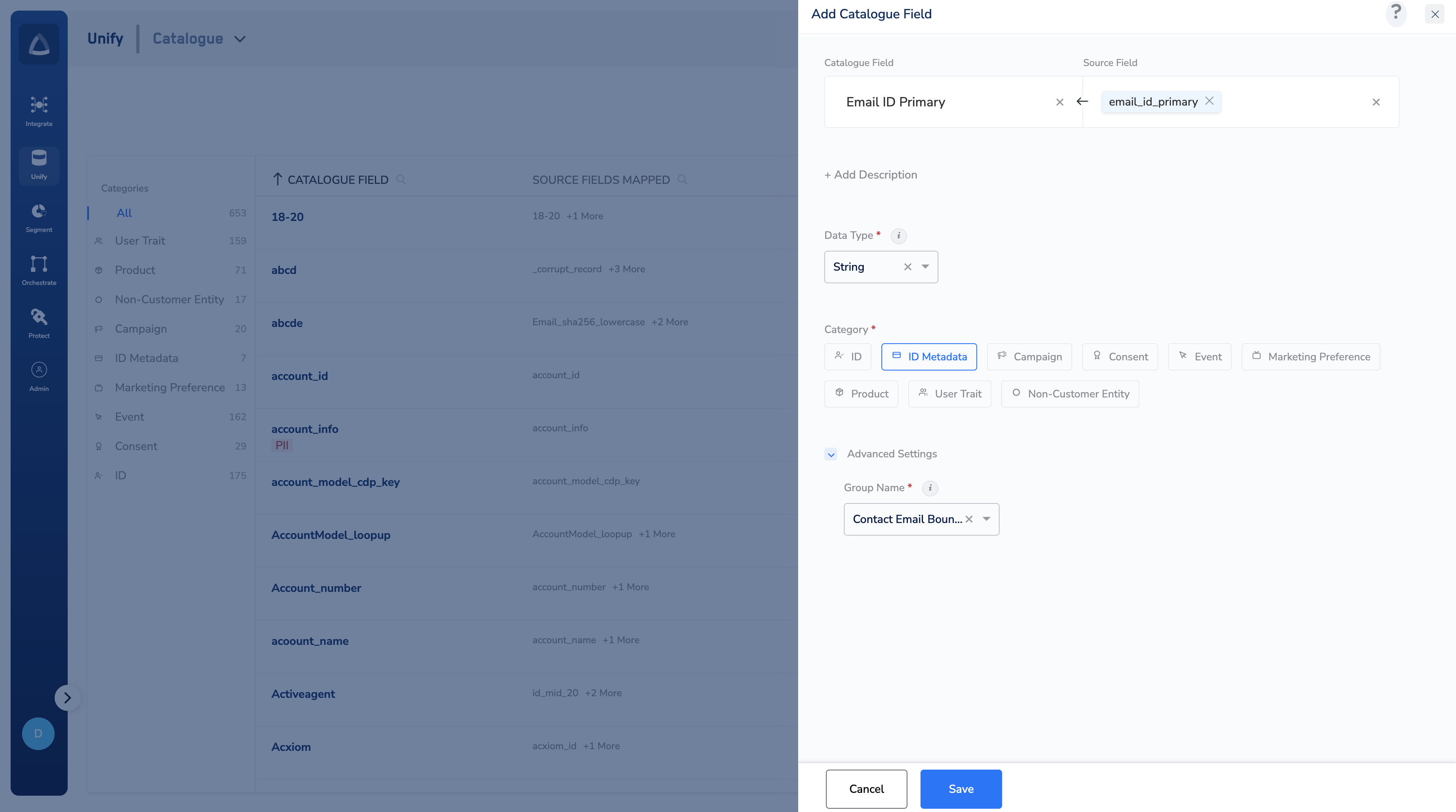 Enter a Catalogue Field. As you type, suggestions based on the existing Catalogue Fields appear. You can choose a suggested Catalogue Field or click +Add Catalogue Field to add a new field.