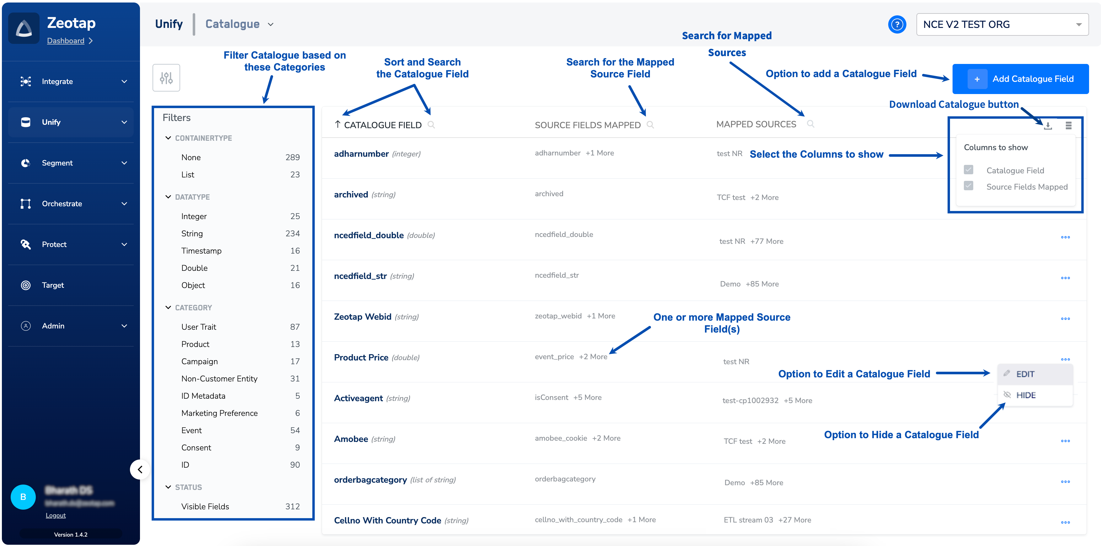 | Catalogue Field | This is the list of fields available in your Zeotap catalogue for mapping. To know more about the editable and non-editable fields, refer here. |