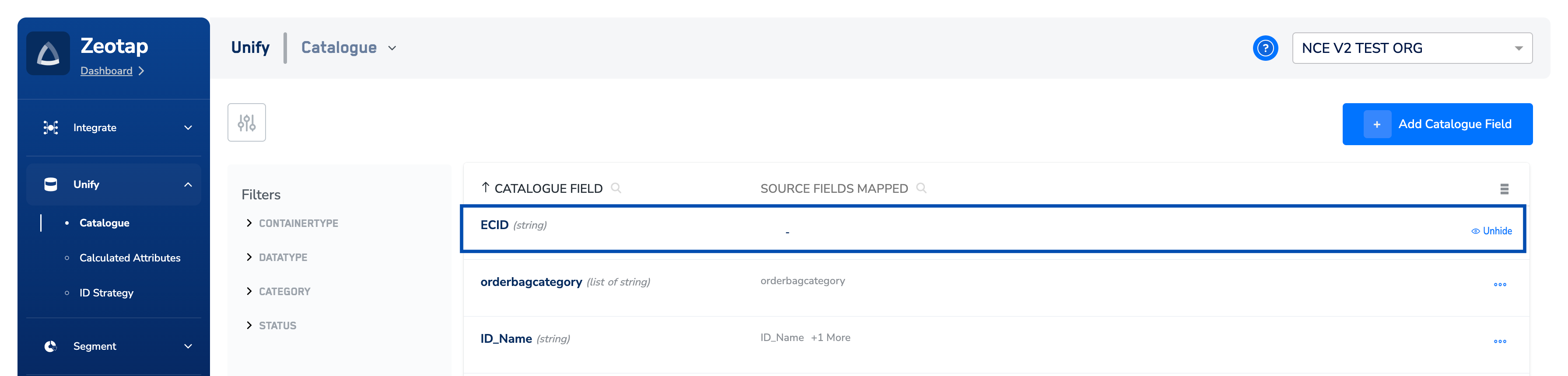 - Hiding an attribute from the Zeotap Catalogue affects its visibility in the downstream modules like Audience, Journeys,Source Mapping and Destinations for new creations. However, it continues to exist in the backend database schema.
