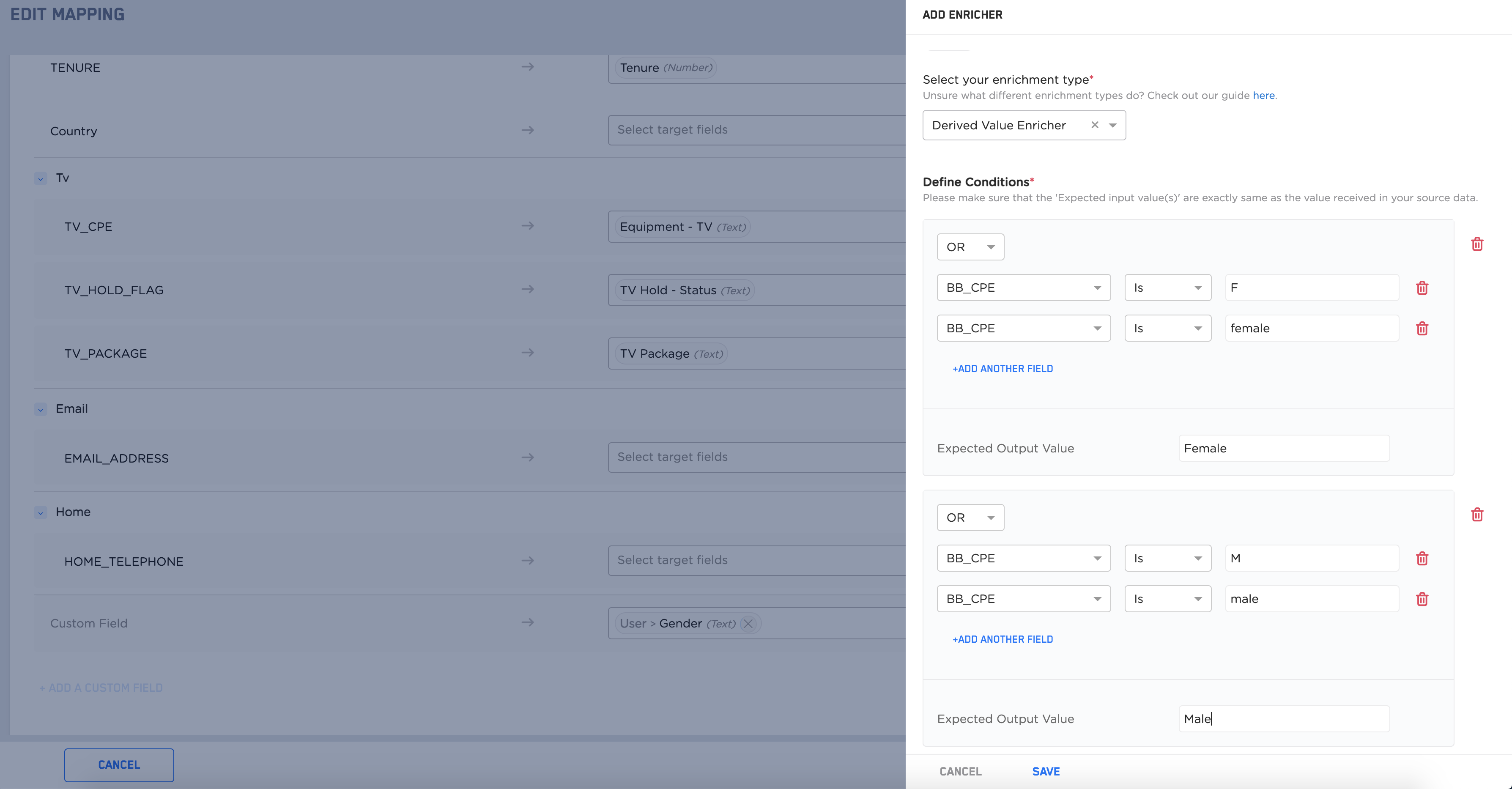 Gender. The incoming values F and female are mapped to the expected output value Female. Similarly, the incoming values M and male are mapped to the expected output value Male.