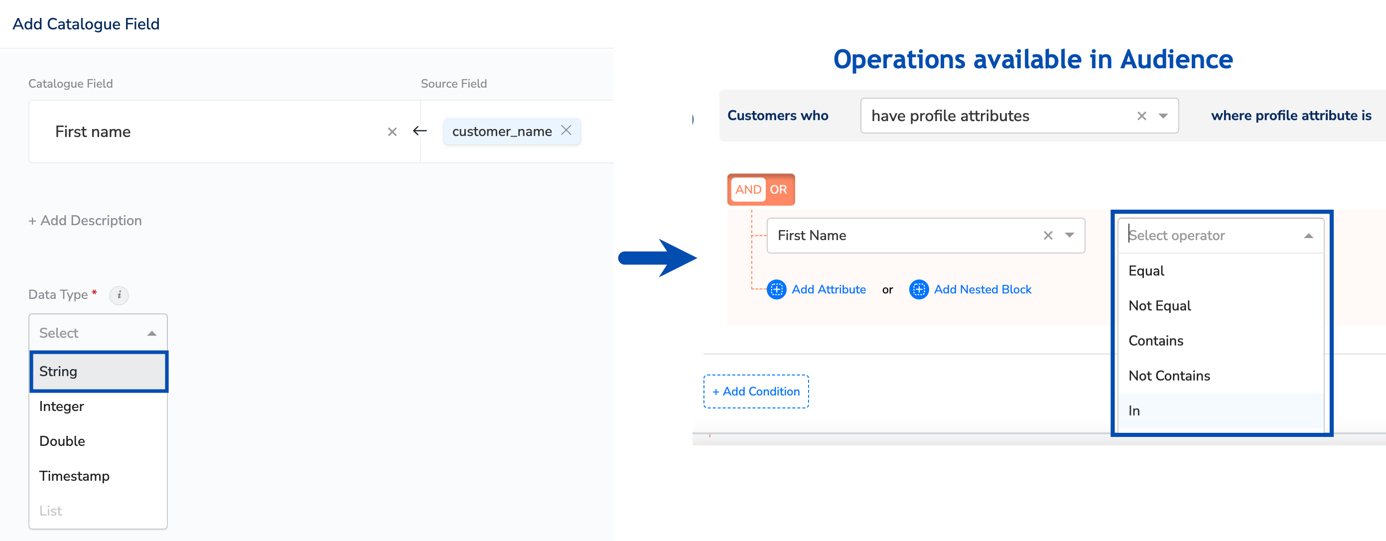 You can use the ‘String’ data type in the Zeotap Catalogue to represent text, numbers and alpha-numeric values like Firstname, Lastname as per your use case. Note that the operations available in the activation/downstream modules like Audiences and Journeys depend on the data type selected when adding the catalogue field. In the below image, you can see the illustration of an example of a Catalogue field added as a String, along with the associated operations available for that specific field in Audience.