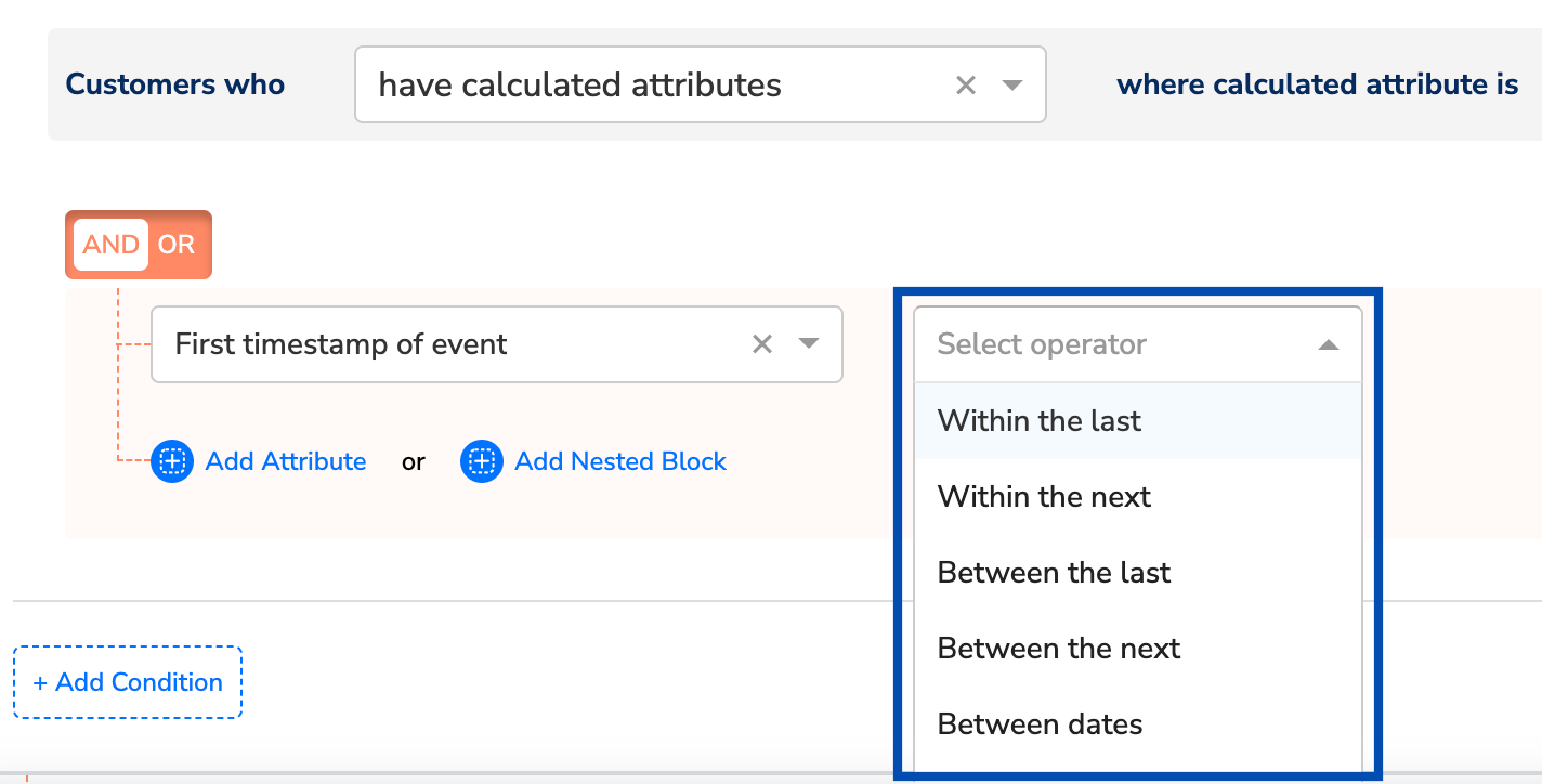 You can use the Timestamp data type in the Zeotap Catalogue to denotes a specific point in time, typically recording when an event occurred. In other words, it refers to a precise date and time combination, stored in a format that enables chronological sorting and calculations between different time instances. For Example, 2023-11-30 15:45:00 - This timestamp represents November 30, 2023, at 3:45 PM. Note that the operations available in the activation/downstream modules like Audiences and Journeys depend on the data type selected when adding the catalogue field. In the below image, you can see the illustration of an example of a Catalogue field added as a Timestamp, along with the associated operations available for that specific field in Audience.
