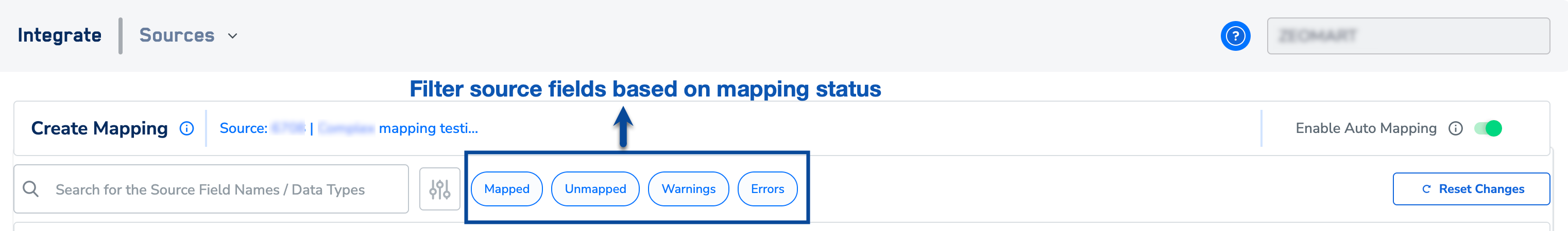 You can also search for a field using the search box or filter fields by status. To filter, select the desired status next to the search box. The available statuses are Mapped, Unmapped, Warnings, and Errors.