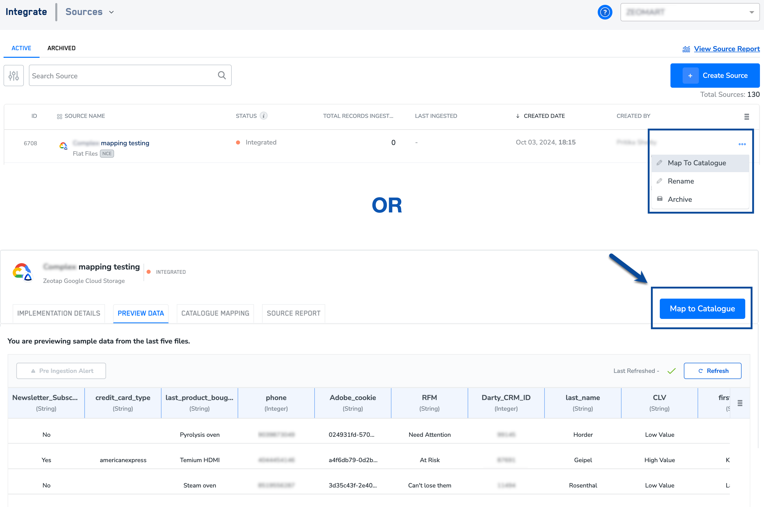 Click the three dots next to the source in the Integrated state and choose Map to Catalogue from the drop-down menu, or select the source, go to the PREVIEW DATA tab or the CATALOGUE MAPPING tab, and then click MAP TO CATALOGUE.