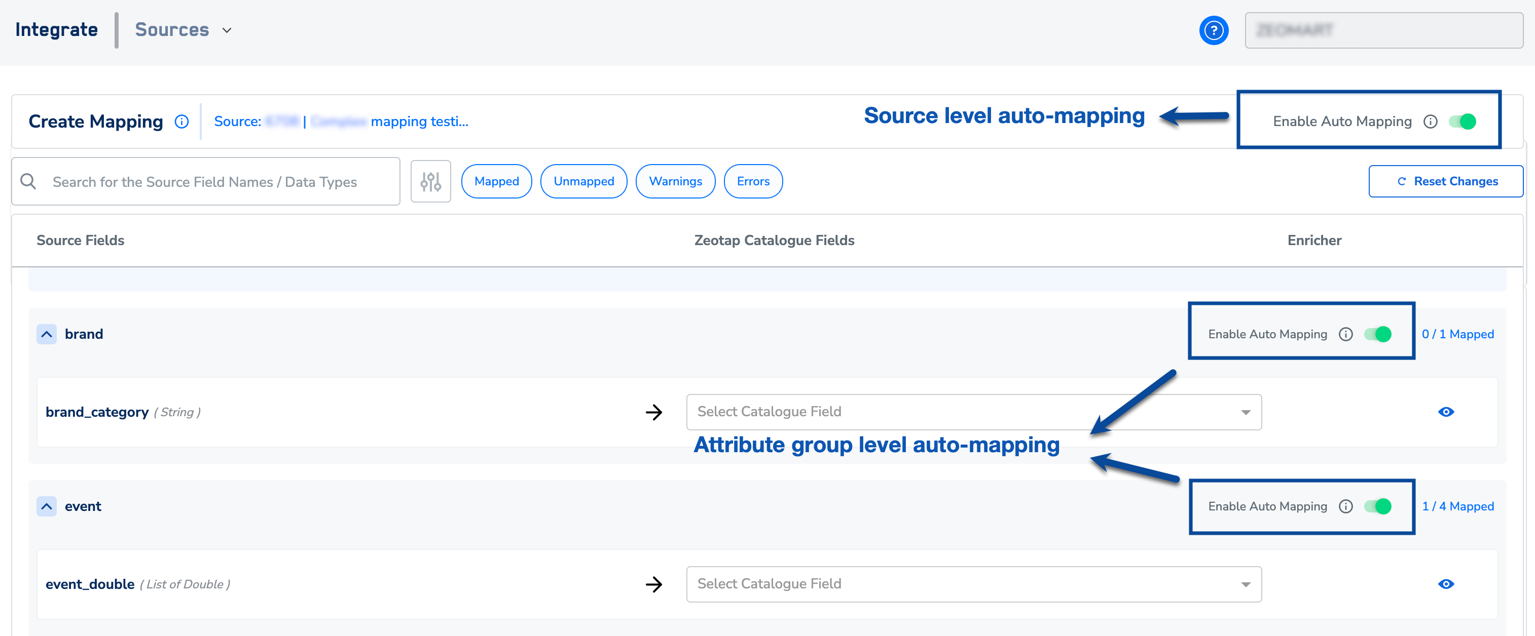 Use the Enable Auto Mapping toggle to turn auto-mapping of source and catalogue fields on or off. Auto mapping uses the catalog name and previous mappings to automatically map source fields to catalog fields. Note that auto-mapping is available at both the source level and the individual category level. To learn more about how auto-mapping works, refer here.